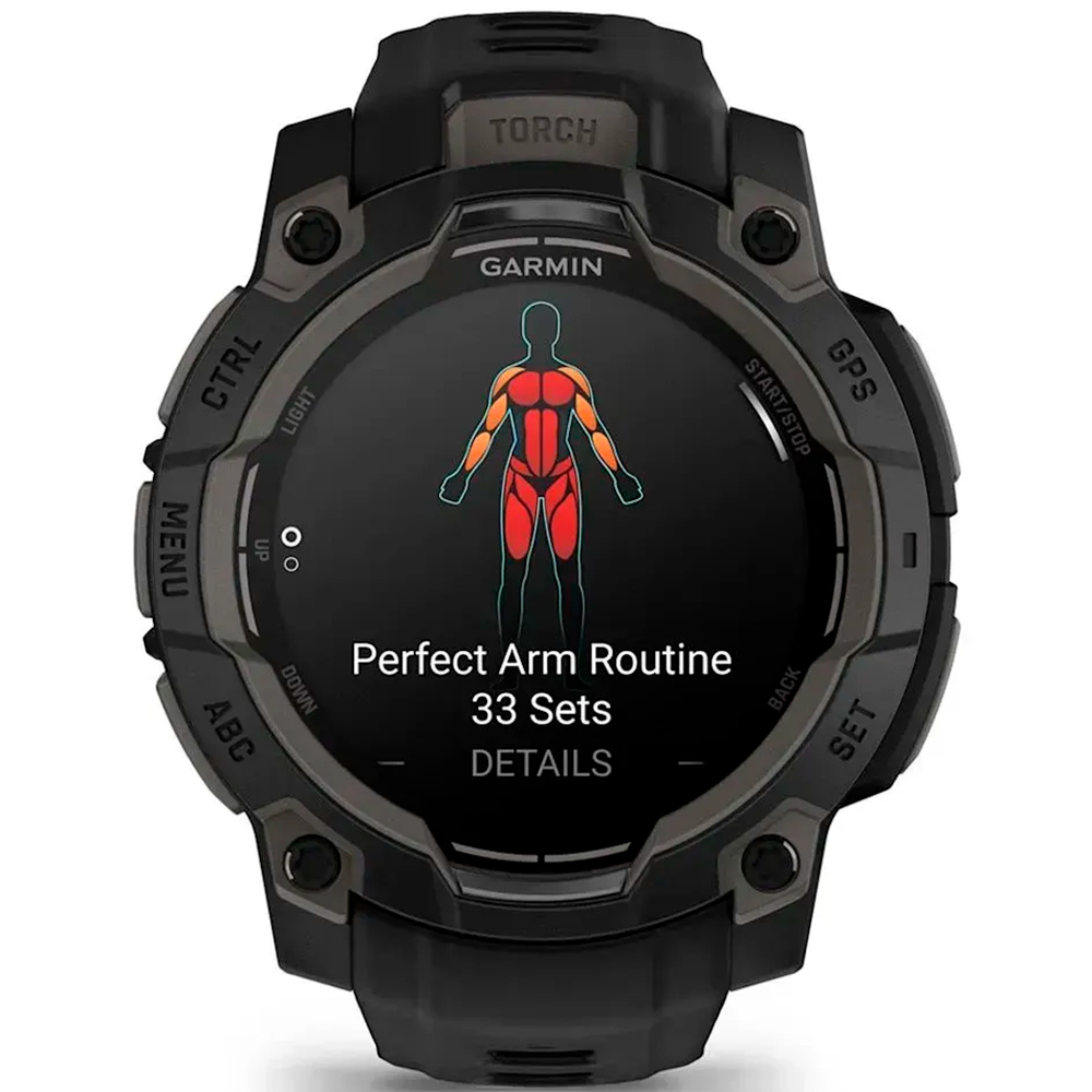 Garmin Instinct 3 створений для найекстремальніших умов. Його міцний корпус з посиленим безелем відповідає стандарту 10ATM та гарантує стійкість до ударів, температурних перепадів і води (водозахист до 100 м). Вбудований LED-ліхтарик із регульованою яскравістю, червоним світлом і стробоскопічним режимом забезпечує видимість у темряві, що ідеально підходить для нічних походів чи екстрених ситуацій.