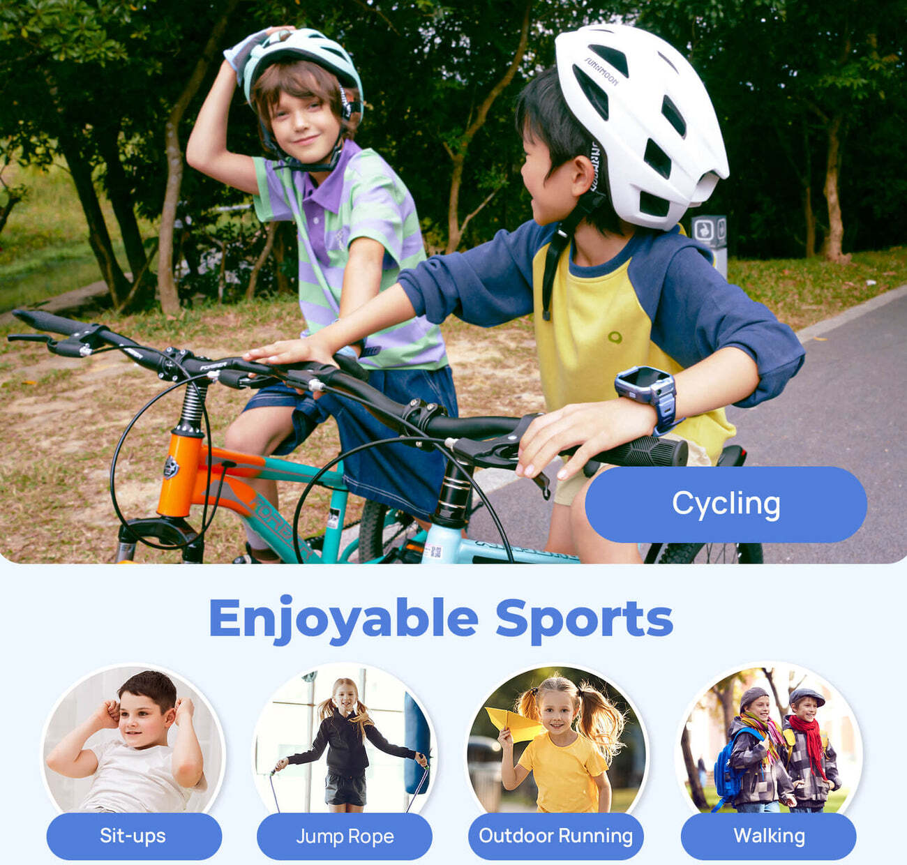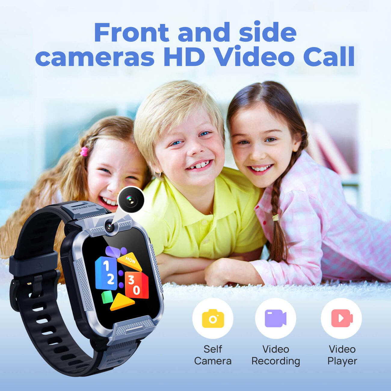 Завдяки Nano-SIM годинник підтримує незалежні дзвінки, голосові повідомлення та відеодзвінки — батьки завжди бачать дитину. Дві камери по 2 МП, фронтальна для селфі та основна, дозволяють робити фото та відео, а хмарний альбом зберігає знімки. Є голосовий мікрочат між годинниками, сімейний груповий чат, погода, будильник, ліхтарик та магазин циферблатів.