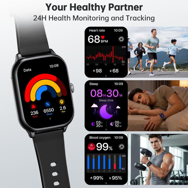 Великий 1,85-дюймовий IPS-екран з роздільною здатністю 320×386 забезпечує яскраве та деталізоване зображення навіть на сонці. Сенсорний екран реагує швидко та плавно, дозволяючи легко гортати меню, переглядати сповіщення чи керувати функціями. Тонкий корпус товщиною лише 11,6 мм і пластиковий матеріал роблять годинник легким і зручним на руці, а силіконовий ремінець приємний до шкіри та надійно фіксується.