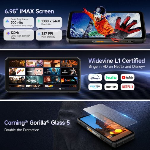 Смартфон оснащений великим 6,95-дюймовим дисплеєм з високою роздільною здатністю FHD+ та плавною частотою оновлення 120 Гц, що забезпечує яскраве, чітке зображення навіть під сонцем. Захист Corning Gorilla Glass 5 робить екран стійким до подряпин та падінь, а великий розмір ідеально підходить для перегляду фільмів, ігор чи навігації.