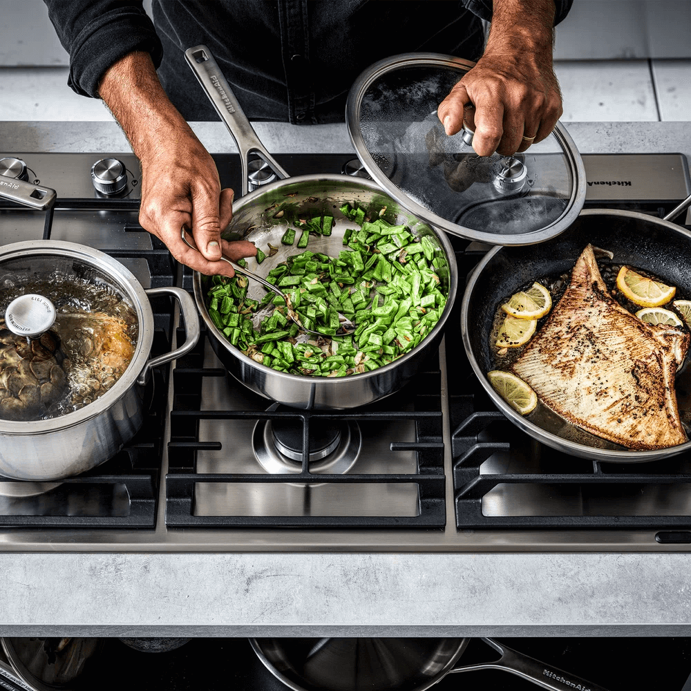 Багатошарова нержавіюча сталь потужна та елегантна з красивою матовою поверхнею. Алюмінієва серцевина забезпечує рівномірне розподілення тепла. Цей посуд прослужить вам все життя.