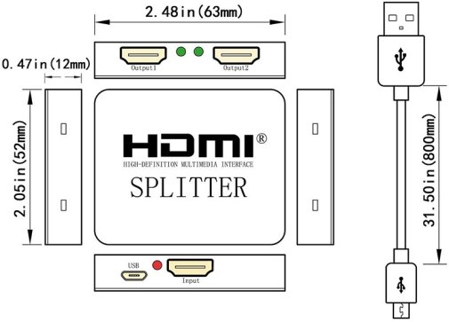 Корпус виконаний з міцного пластику, що робить пристрій легким і зручним для використання вдома, в офісі або для презентацій. За потреби сплітер може живитися через додатковий USB-кабель, що забезпечує стабільну роботу навіть при довгих HDMI-з’єднаннях.