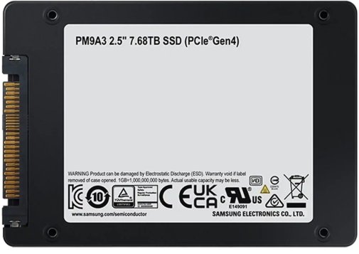 Samsung PM9A3 7.68TB — це корпоративний SSD-накопичувач преміумкласу, спеціально створений для серверів, дата-центрів та високонавантажених робочих станцій. У форм-факторі 2.5" з інтерфейсом U.2 (PCIe 4.0 x4 NVMe) він ідеально вписується в сучасну серверну інфраструктуру, забезпечуючи високу щільність зберігання та стабільну роботу в умовах постійного інтенсивного навантаження.