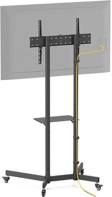Для додаткової зручності модель оснащена практичною полицею розміром 400 × 230 мм, на якій можна розмістити медіаплеєр, ігрову консоль чи інше обладнання. Стійка виконана в класичному чорному кольорі, що легко вписується в будь-який інтер'єр.