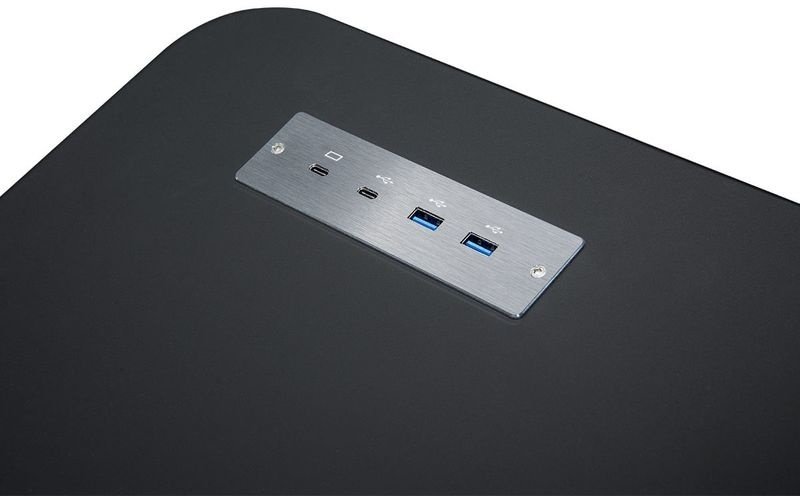 Ключова відмінність ELITE від базових моделей Royal — вбудована 7-в-1 докстанція, інтегрована прямо в стільницю. На верхній площині розміщені два порти USB-A (USB 3.1 Gen 1, швидкість 5 Гбіт/с), порт USB-C з функцією Power Delivery для зарядки ноутбука і другий USB-C лише для передачі даних. На нижній стороні стільниці знаходяться DisplayPort 1.4 і HDMI 2.0 з підтримкою роздільної здатності до 4K при 60 Гц кожен, а також порт USB-C для підключення живлення від адаптера до 100 Вт. Таким чином, до ноутбука можна під'єднатися одним кабелем USB-C і водночас отримати живлення, два зовнішні монітори в 4K, два USB-A і USB-C пристрої — без жодного хаба або адаптера на столі.