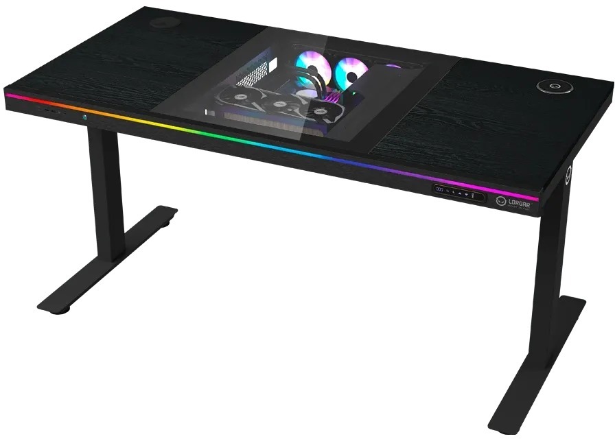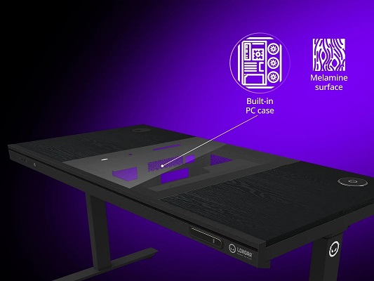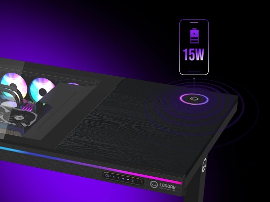 Окремо виділяється набір сучасних зручностей: вбудована бездротова зарядка Qi потужністю 15 Вт, порти USB-A та USB-C для швидкого заряджання пристроїв, фронтальна панель з аудіороз’ємами. Система організації кабелів повністю приховує дроти в спеціальних каналах і відсіках, забезпечуючи ідеальну чистоту робочого простору. RGB-підсвічування з керуванням через мобільний застосунок додає столу стильний вигляд і можливість синхронізації з ігровими подіями.