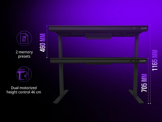 Однією з головних переваг столу є двомоторна електрична система регулювання висоти в діапазоні від 705 до 1165 мм, що дозволяє легко переходити між сидячим і стоячим положенням для підтримки здорової постави. Механізм працює дуже тихо, має два режими пам’яті для швидкого повернення до улюблених висот та інтелектуальне керування живленням. Максимальне навантаження досягає 80 кг, а простора стільниця ідеально підходить для багатомоніторних конфігурацій, клавіатури, миші та іншої периферії.
