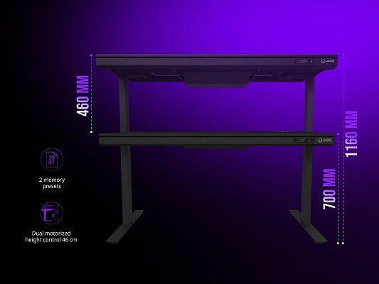 Однією з ключових переваг столу є подвійна електрична система регулювання висоти з двома моторами. Вона працює плавно й майже безшумно, дозволяючи змінювати висоту в діапазоні від 700 до 1160 мм — це дає змогу легко перемикатися між положенням сидячи та стоячи. Така функціональність допомагає підтримувати здорову поставу під час тривалих сесій, зменшуючи навантаження на спину та шию. Користувач може запрограмувати два улюблені рівні висоти, щоб перемикання відбувалося одним натисканням кнопки, а міцна алюмінієва рама з посиленого сталевого профілю витримує до 80 кг без найменшого хитання.