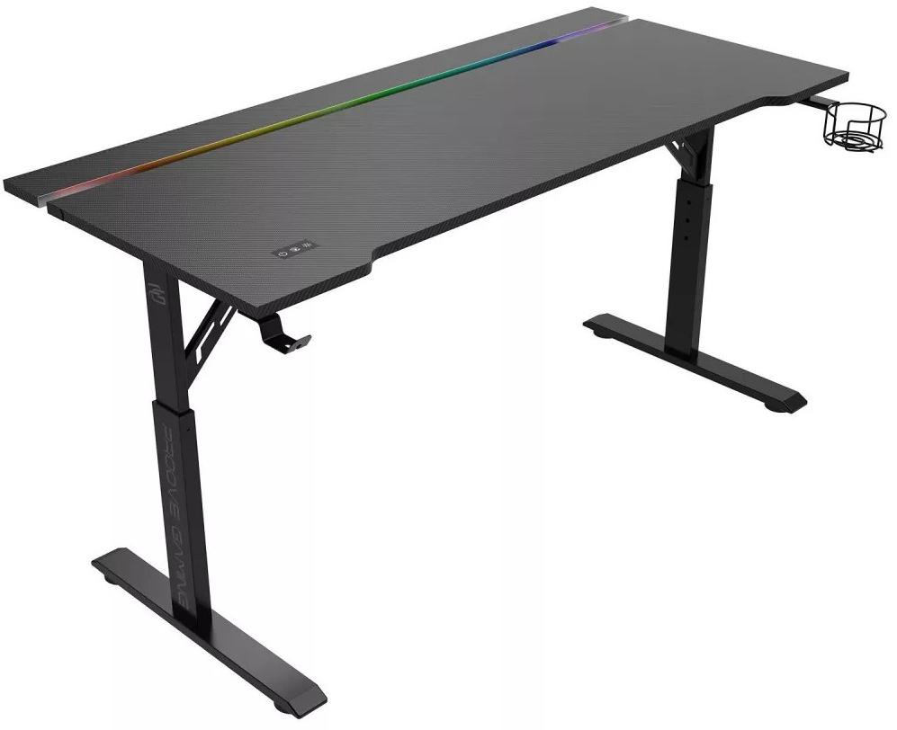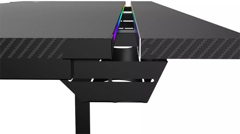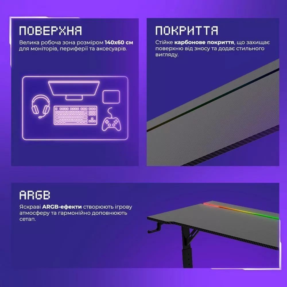 Надійна конструкція столу забезпечує стабільність під час найінтенсивніших сесій. Каркас виготовлений зі сталі, що гарантує міцність і витримує навантаження до 60 кг. Стільниця товщиною 15 мм зроблена з PB-плити з текстурованим карбоновим покриттям – воно зносостійке, приємне на дотик і легко очищається. Розмір поверхні 140×60 см дає достатньо простору для кількох моніторів, а регульована висота від 71 до 79 см дозволяє ідеально підлаштувати стіл під зріст і стиль гри.