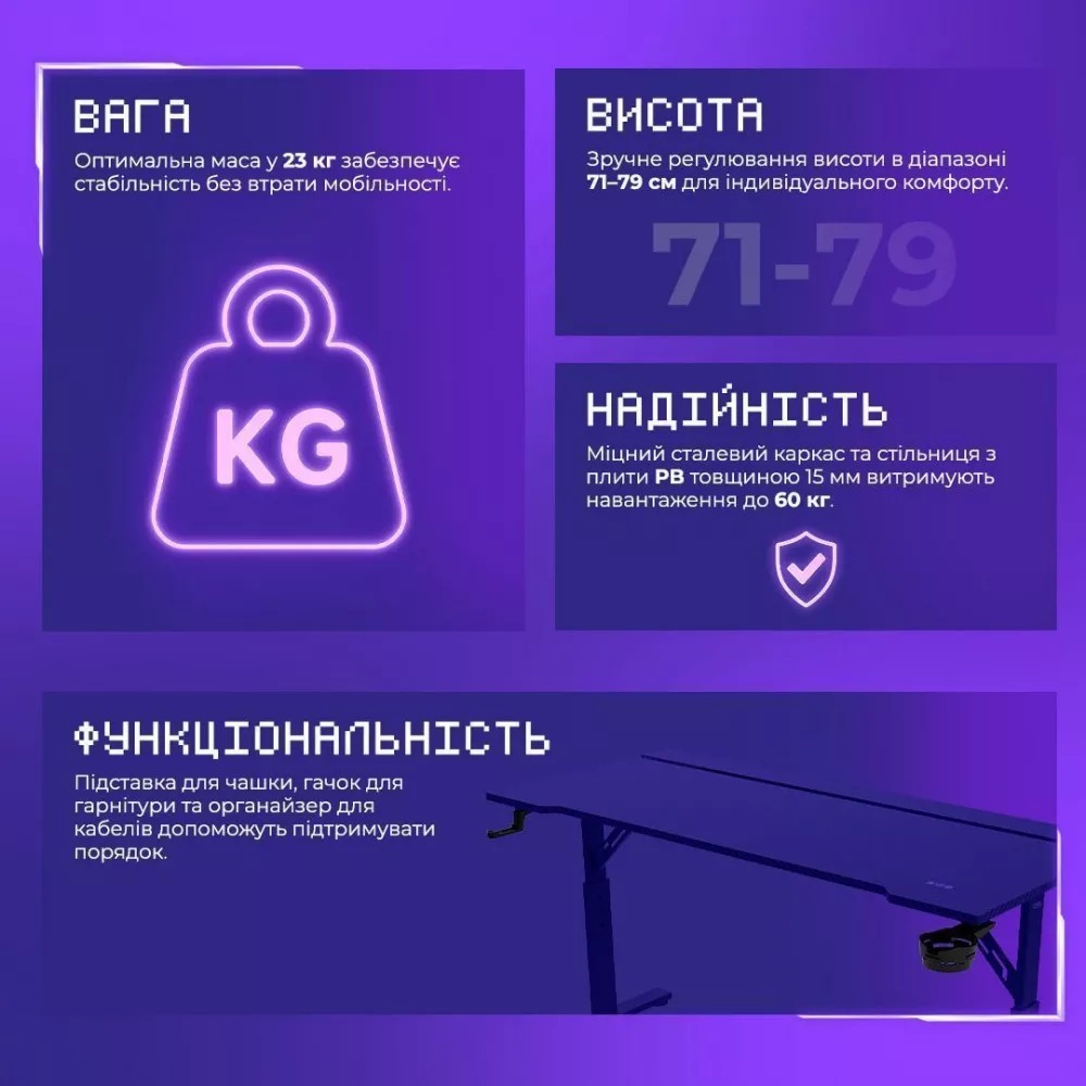 З вагою 23 кг стіл залишається мобільним, але водночас стійким. Proove Gaming Glitch — це не просто меблі, а повноцінний ігровий хаб, який поєднує ергономіку, стиль і практичність для справжніх ентузіастів.