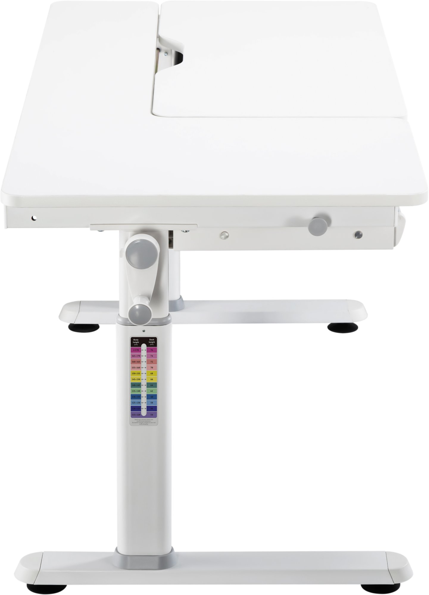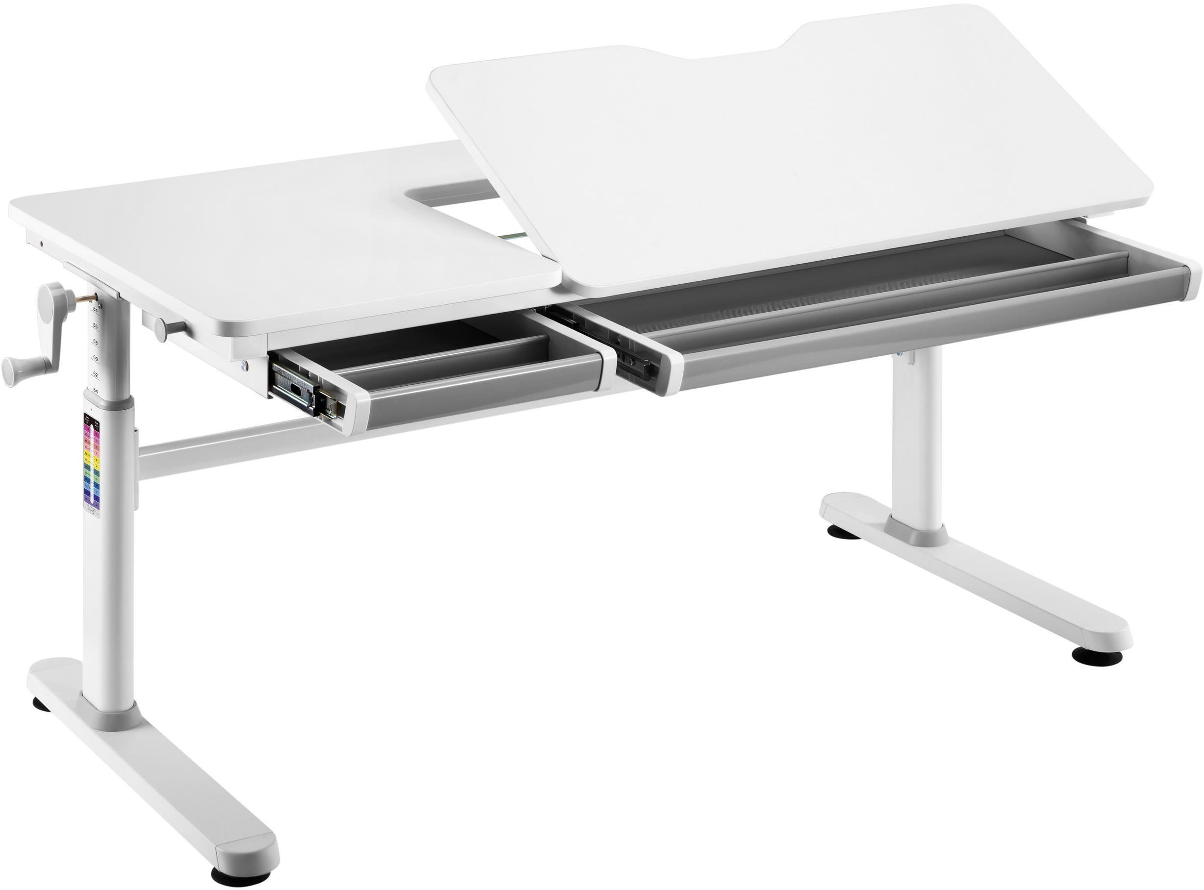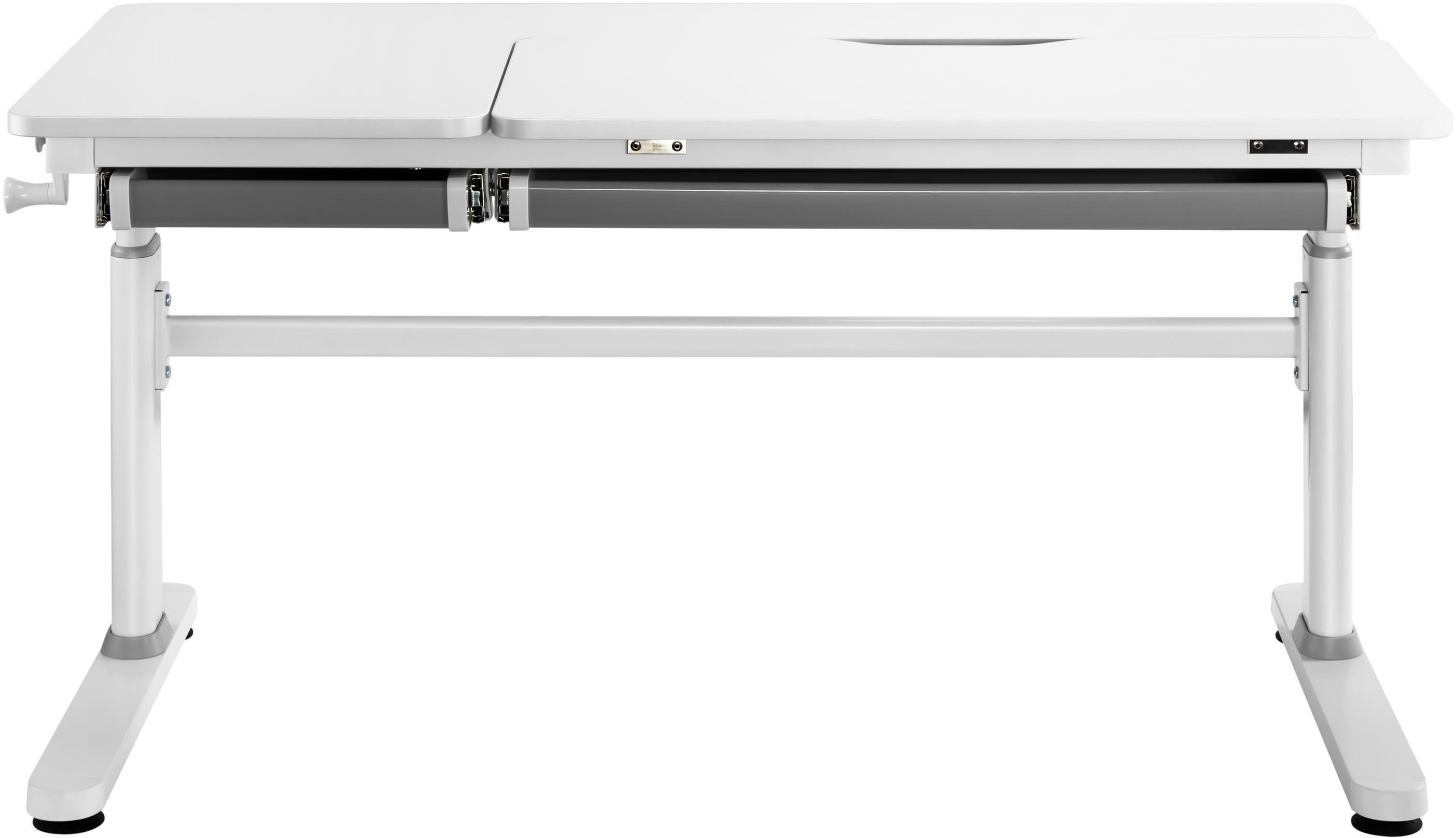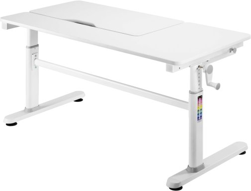 Особливу увагу привертає ергономіка та безпека. Плавне регулювання висоти забезпечує зручна ручка-кривошип у поєднанні з пневматичним механізмом, а спеціальний захист від защемлення пальців робить користування абсолютно безпечним навіть для наймолодших. Стіл оснащений зручною шухлядою для канцелярії, практичним гачком для ранця чи пляшки з водою та ніжками-локерами, які дозволяють ідеально вирівняти конструкцію на будь-якій підлозі.