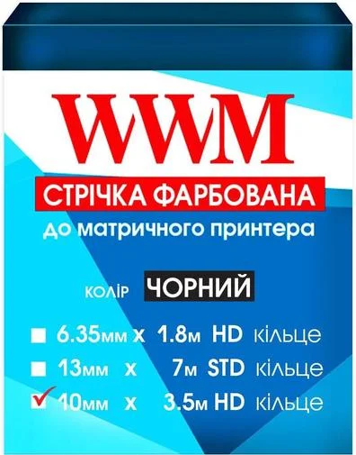 Стрічка для друкувальних пристроїв від компанії WWM. Виріб призначений для матричних принтерів. Він пофарбований в чорний колір. Довжина стрічки - 3.5 метрів, а ширина - 10 мм.