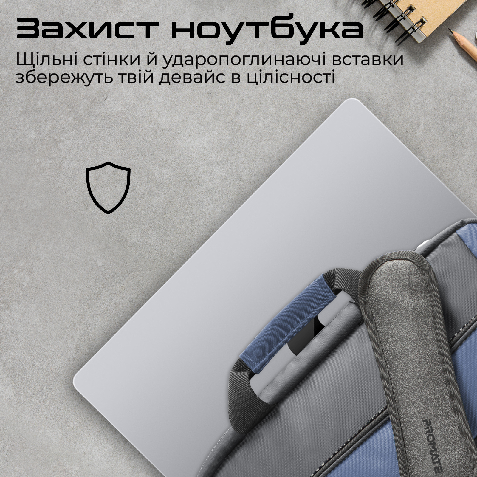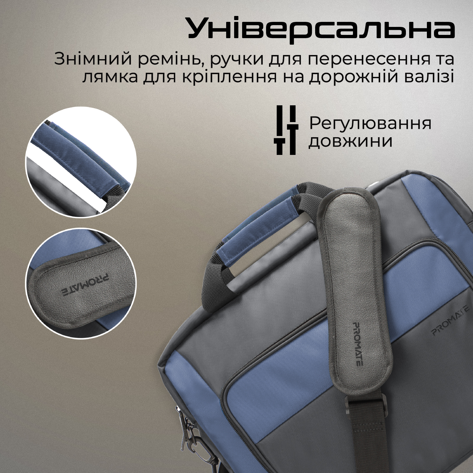 Limber-MB від Promate — зручна та містка сумка для 15.6" ноутбука, яка стане надійним компаньйоном у ділових та повсякденних поїздках. А м'які вставки, великі відсіки та регульований ремінь забезпечать комфортне використання.