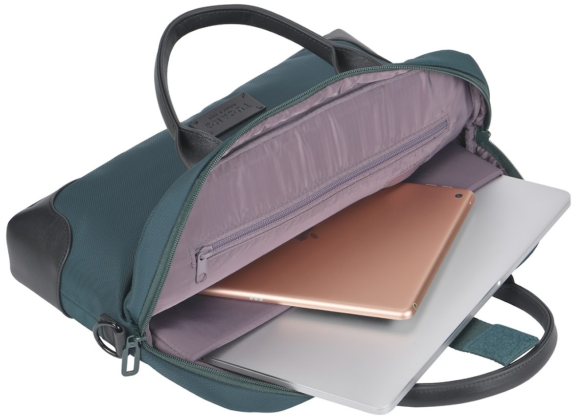 Сумка має компактну конструкцію з двома основними відділеннями, що забезпечують організоване зберігання. Внутрішній захисний відсік із м’якою підкладкою призначений для ноутбука, надійно фіксує його та захищає від подряпин і ударів. Додаткове відділення підходить для планшетів, документів, зарядних пристроїв чи особистих речей. Зовнішня кишеня на блискавці забезпечує швидкий доступ до дрібниць, таких як телефон, ключі чи картки.
