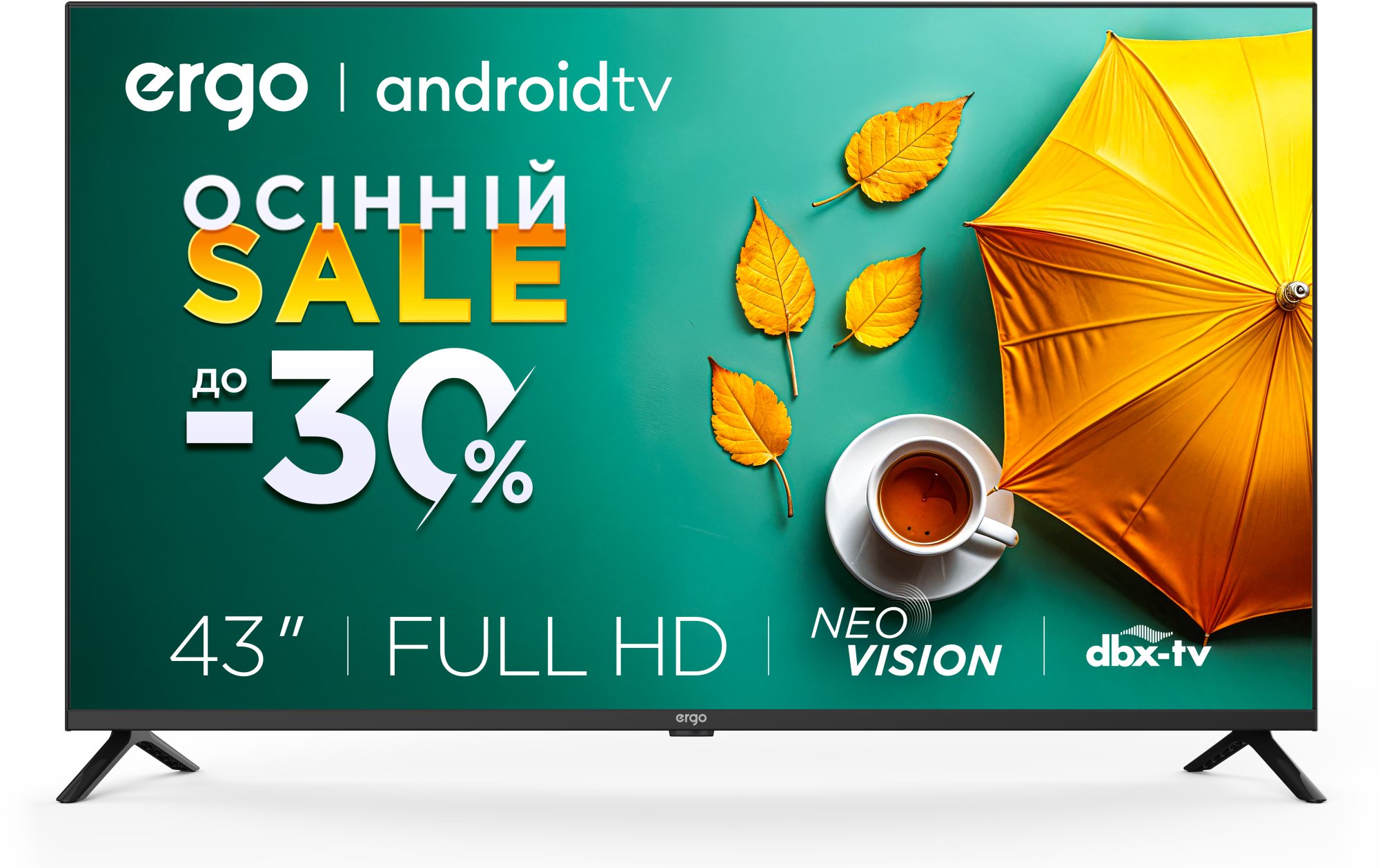 Ergo 43GFS6500 — телевізор у сучасному дизайні, розроблений спеціально для поціновувачів чудової якості та збалансованої вартості. Він оснащений вбудованими динаміками, які подарують неймовірний глибокий звук для повного занурення у світ ТВ.