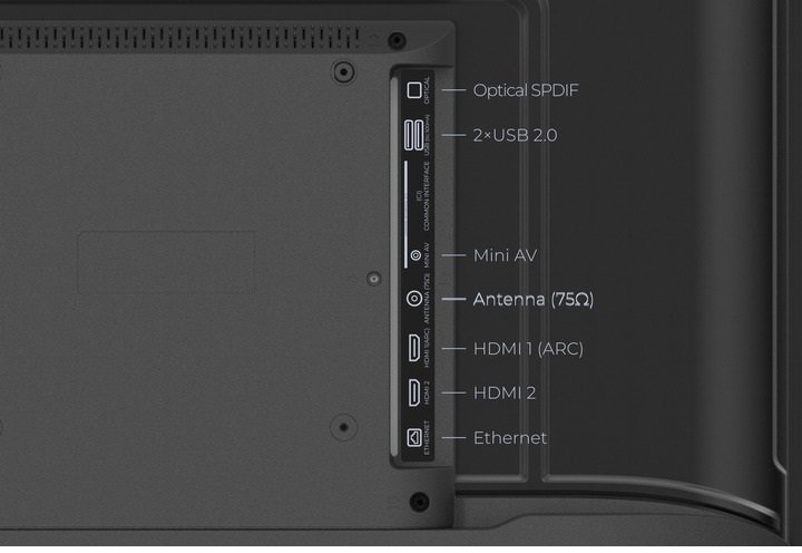 Для підключення доступні два порти HDMI, два USB 2.0, Wi-Fi (5 ГГц) і Bluetooth 5.1. Вбудовані тюнери DVB-T/T2/C/C2 дозволяють приймати ефірне та кабельне цифрове телебачення.