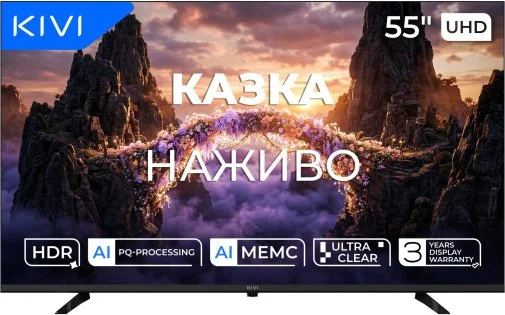 Kivi U800KB — це Smart TV на базі Google TV, що поєднує стильний дизайн, сучасні технології та зручне керування. Екран з роздільною здатністю UHD (3840x2160) на LCD-матриці з LED-підсвіткою має антивідблискове покриття, широкий кут огляду 178°/178° та контрастність 1700:1. Підтримка HDR, HLG і Dolby Vision забезпечує глибокі кольори та чітку деталізацію зображення.