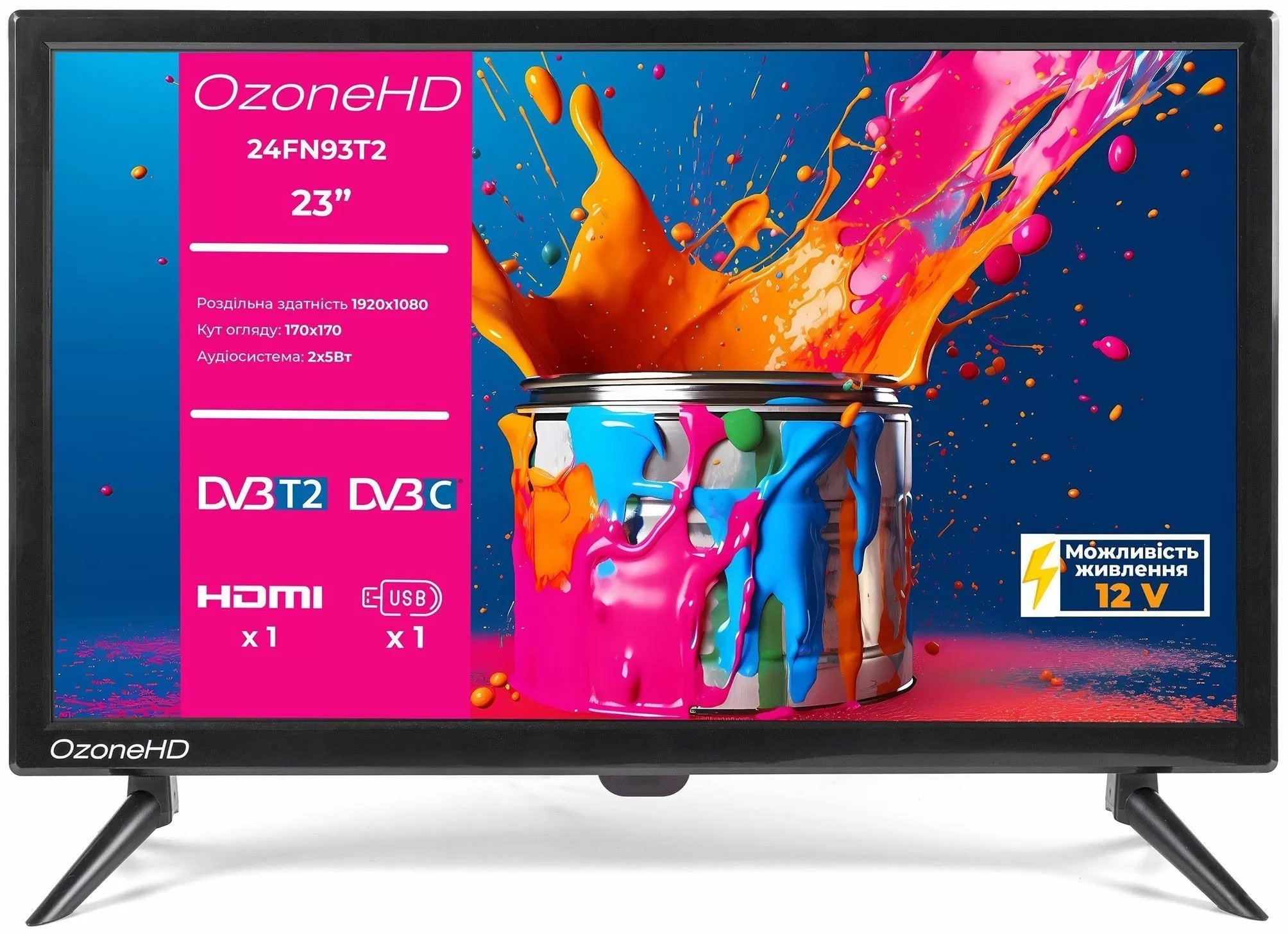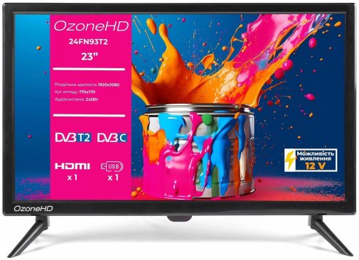 Серед портів — HDMI, VGA та USB, тому до телевізора легко підключити ноутбук, ігрову приставку або будь-який інший пристрій. Кріплення VESA 75×75 мм дозволяє розмістити його на стіні, а стандартні ніжки підійдуть для встановлення на поличці чи тумбі. Окрема перевага моделі — підтримка живлення від постійного струму 12В, завдяки чому телевізор можна використовувати в кемпері чи на дачі з сонячною панеллю. Це робить OzoneHD N93T2 одним із небагатьох бюджетних телевізорів із такою універсальністю.