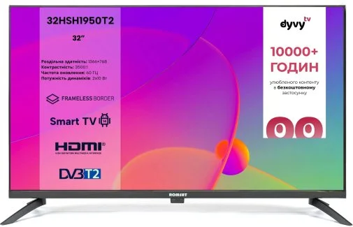 Romsat SH1950T2 — це сучасний смарттелевізор, який поєднує доступність з широким набором функцій для комфортного перегляду контенту вдома. Модель працює на операційній системі Android 14, що відкриває доступ до популярних стрімінгових сервісів, додатків і онлайн-відео без додаткових пристроїв. Завдяки компактним розмірам і безрамковому дизайну телевізор органічно впишеться як у невелику кімнату, так і на кухню чи в дитячу.