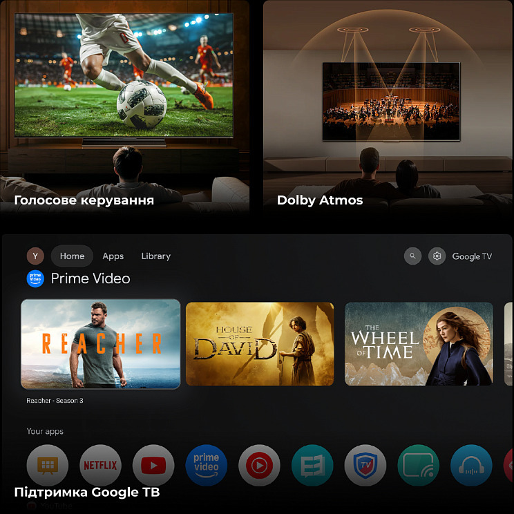 Телевізори серії S100 працюють на Google TV — платформі, що персоналізує контент на основі вподобань кожного члена родини та об'єднує підписки з різних сервісів в одному місці. Голосове керування Google дозволяє шукати фільми, дізнаватись погоду або керувати пристроями розумного будинку голосом. Для найменших передбачений окремий дитячий профіль із безпечним контентом та фільтрами. Chromecast вбудований прямо в телевізор — трансляція відео чи музики зі смартфона на великий екран займає лічені секунди.
