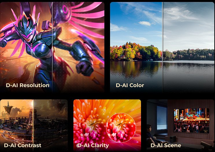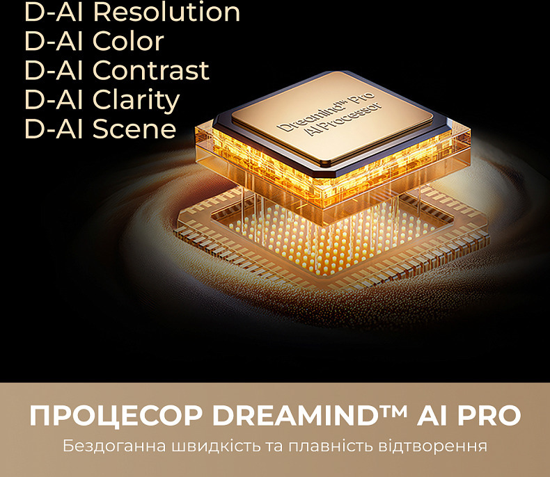 Серце серії S100 — процесор Dreamind Pro AI, який аналізує кожен кадр у реальному часі та автоматично налаштовує яскравість, контраст і кольори без будь-якого втручання користувача. Технологія D-AI Contrast постійно балансує світлі та темні ділянки, роблячи зображення об'ємнішим. D-AI Scene розпізнає тип контенту — фільм, спорт, природа, гра — і підбирає оптимальні параметри під конкретний жанр. D-AI Color забезпечує точну передачу кольорів, наближену до того, як їх сприймає людське oko, а алгоритми підвищення чіткості дозволяють навіть контенту у форматі 2K виглядати на рівні 4K.