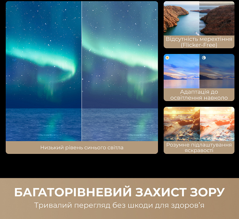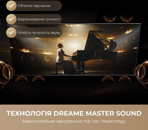 Технологія Multiplay Eye Care поєднує кілька механізмів захисту зору: усунення мерехтіння екрана, зниження рівня синього світла та м'яке підсвічування. Це суттєво зменшує втому очей під час тривалого перегляду й робить телевізор комфортним для щоденного використання всією родиною — від дітей до дорослих.