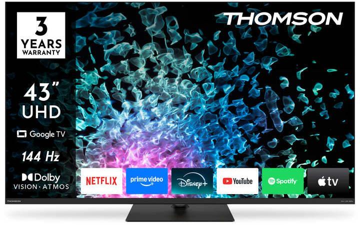 Телевізор Thomson Google TV MiniLED поєднує передові технології дисплея та аудіо зі смартфункціями для створення незабутнього досвіду перегляду. Технологія Mini LED забезпечує точний контроль контрастності та високий рівень яскравості, а Quantum Dot технологія гарантує точну передачу кольорів і широкий кольоровий діапазон для яскравих і реалістичних зображень. Підтримка Dolby Vision оптимізує якість зображення завдяки динамічному HDR, адаптуючись до кожної сцени для кращої деталізації в темних і світлих областях. Роздільна здатність 4K Ultra HD забезпечує кришталево чисте зображення. Частота оновлення 144 Гц зменшує розмиття руху, що ідеально підходить для спортивних трансляцій, ігор чи динамічних фільмів.