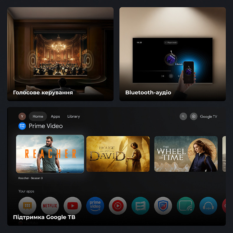 Операційна система Google TV об'єднує всі стримінгові сервіси, підписки та застосунки в одну персоналізовану стрічку. Телевізор запам'ятовує вподобання і пропонує рекомендації, які влучають у точку. Голосове керування через Google Assistant дозволяє шукати фільми, перевіряти погоду або керувати розумним будинком — прямо з дивана, не торкаючись пульта. Для дітей передбачений окремий профіль із фільтрацією контенту за віком і контролем часу перегляду. А вбудований Google Meet перетворює телевізор на зручний засіб відеозв'язку — співрозмовники видні на великому екрані, у повний зріст.