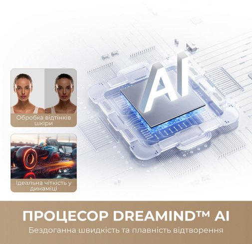 В основі серії — QLED-матриця з роздільною здатністю 3840×2160 пікселів і шаром квантових точок, завдяки якому телевізор відтворює понад мільярд відтінків кольору. Кольори на екрані виглядають природно та плавно: небо має м'який градієнт, вода — глибину, а обличчя людей — реалістичну текстуру. За це відповідає алгоритм True Tone на базі штучного інтелекту: він розпізнає людей у кадрі й окремо від фону обробляє відтінки шкіри, усуваючи цифрові артефакти. За оптимізацію кожного кадру в режимі реального часу відповідає процесор Dreamind — він аналізує вхідний сигнал, зменшує шуми, відновлює дрібні деталі та підтягує якість застарілого відео до рівня, близького до 4K.