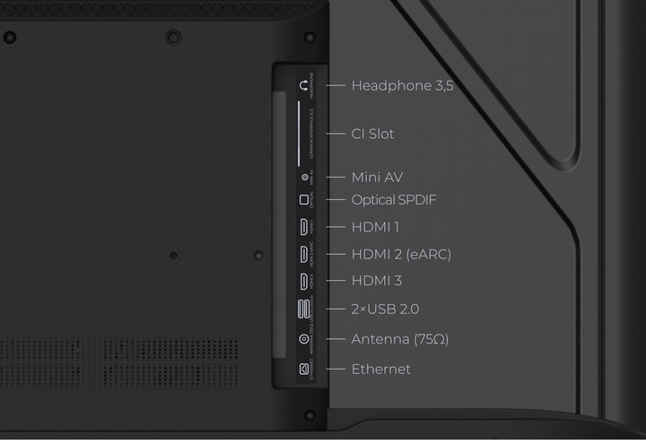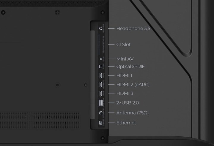 Для підключення доступні три порти HDMI, два USB 2.0, Wi-Fi (5 ГГц) і Bluetooth 5.1. Вбудовані тюнери DVB-T/T2/C/C2 дозволяють приймати ефірне та кабельне цифрове телебачення.