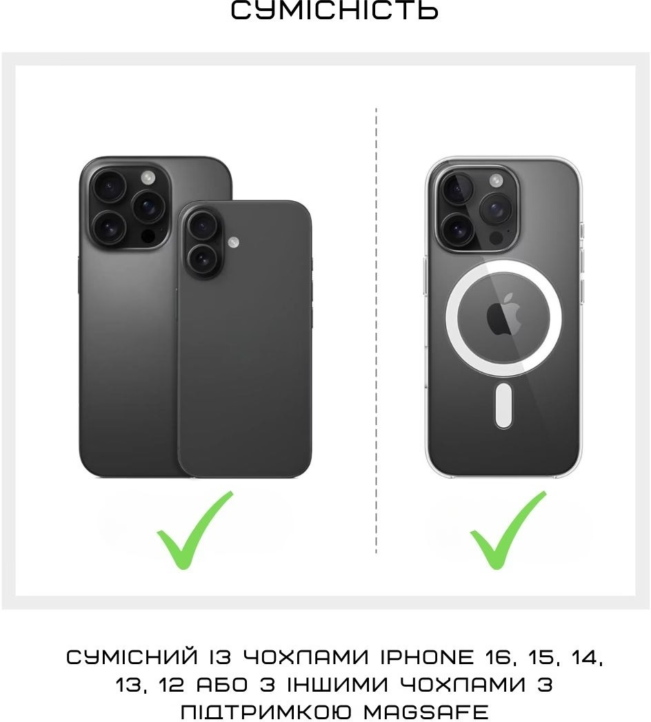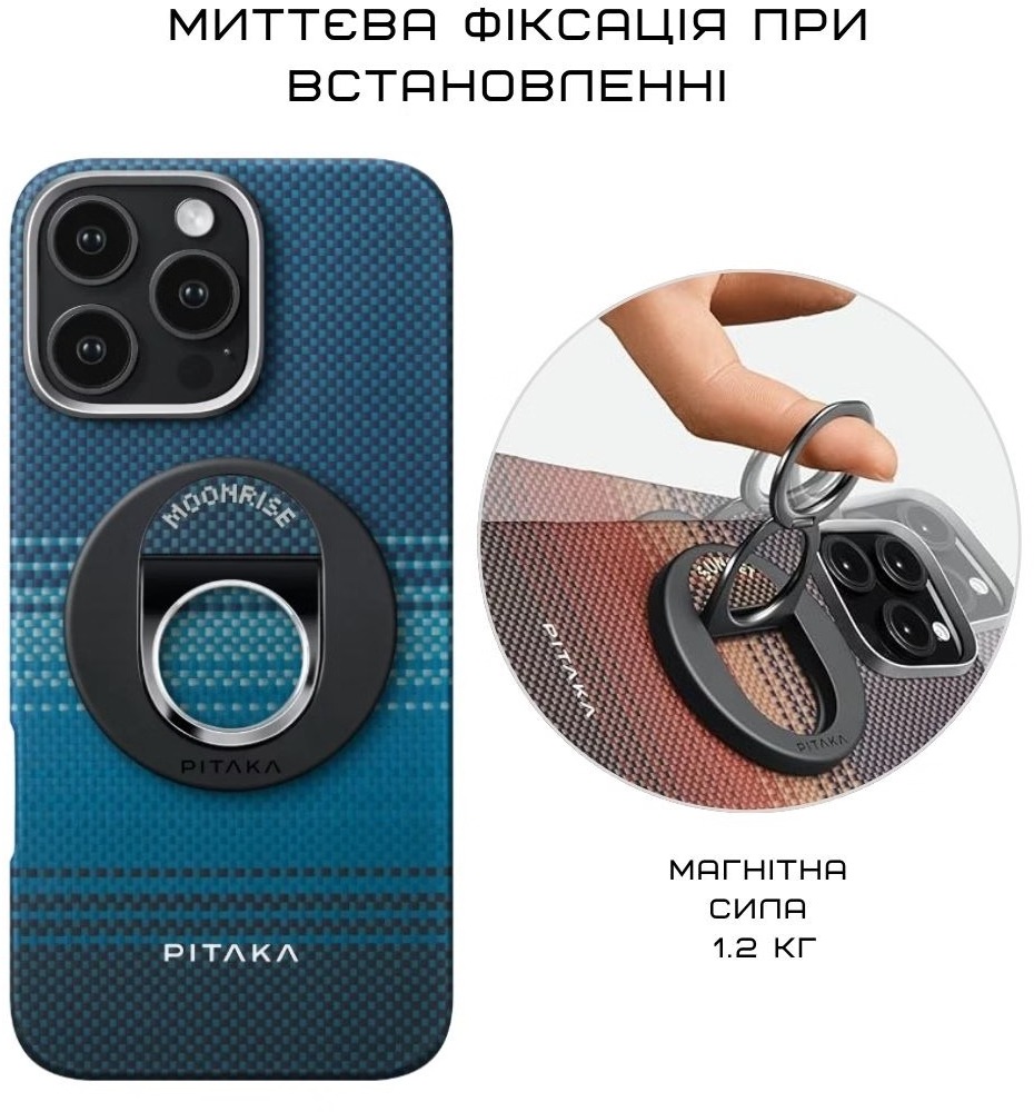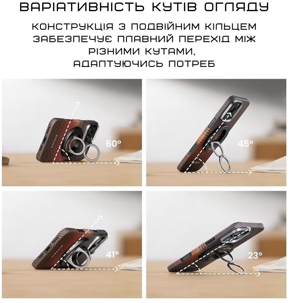 Завдяки магнітній фіксації тримач міцно тримається на MagSafe-сумісних смартфонах, дозволяючи носити телефон лише на одному пальці без страху, що він вислизне. Подвійне кільце з 360-градусним обертанням дає можливість швидко регулювати кут нахилу, перемикатися між портретним і ландшафтним режимами, використовувати як підставку для перегляду контенту або стабільної зйомки.