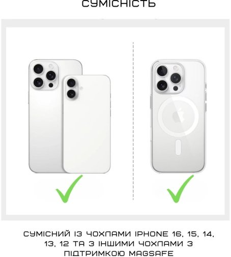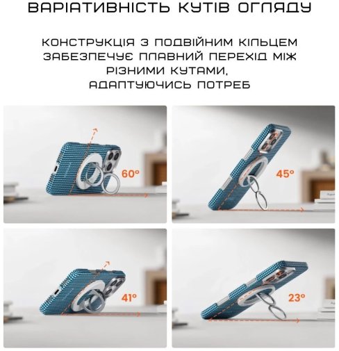 Завдяки магнітній фіксації тримач міцно тримається на MagSafe-сумісних смартфонах, дозволяючи носити телефон лише на одному пальці без страху, що він вислизне. Подвійне кільце з 360-градусним обертанням дає можливість швидко регулювати кут нахилу, перемикатися між портретним і ландшафтним режимами, використовувати як підставку для перегляду контенту або стабільної зйомки.