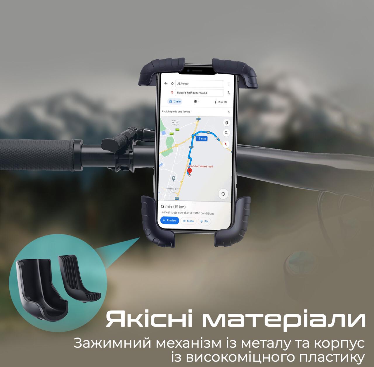 Механізм автоматично стискає телефон при встановленні, а спеціальна кнопка блокування повністю виключає випадкове відкриття. Фіксатори надійно охоплюють бокові грані пристрою, захищаючи його від пошкоджень у разі падіння. Така конструкція робить використання абсолютно безпечним і впевненим на будь-яких маршрутах.