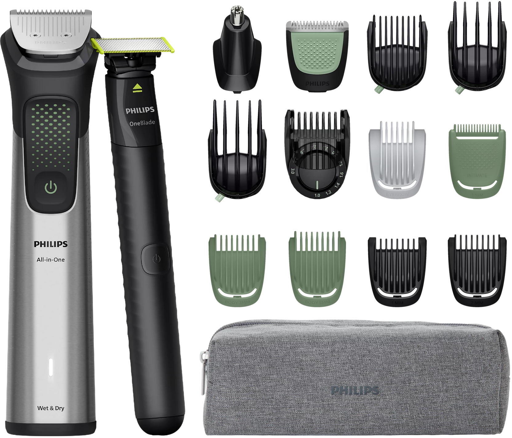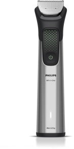 Тример Philips All-in-One Trimmer 9000 Series 17in1 (MG9535/15) — це універсальний набір для комплексного догляду, що поєднує у собі функції тримера для бороди, волосся та тіла. У комплект входять 17 інструментів, які дозволяють створювати різні образи та доглядати за собою від голови до п’ят. Завдяки продуманим насадкам ви легко зможете підстригати бороду, формувати зачіску, доглядати за тілом і навіть видаляти волосся з носа та вух.