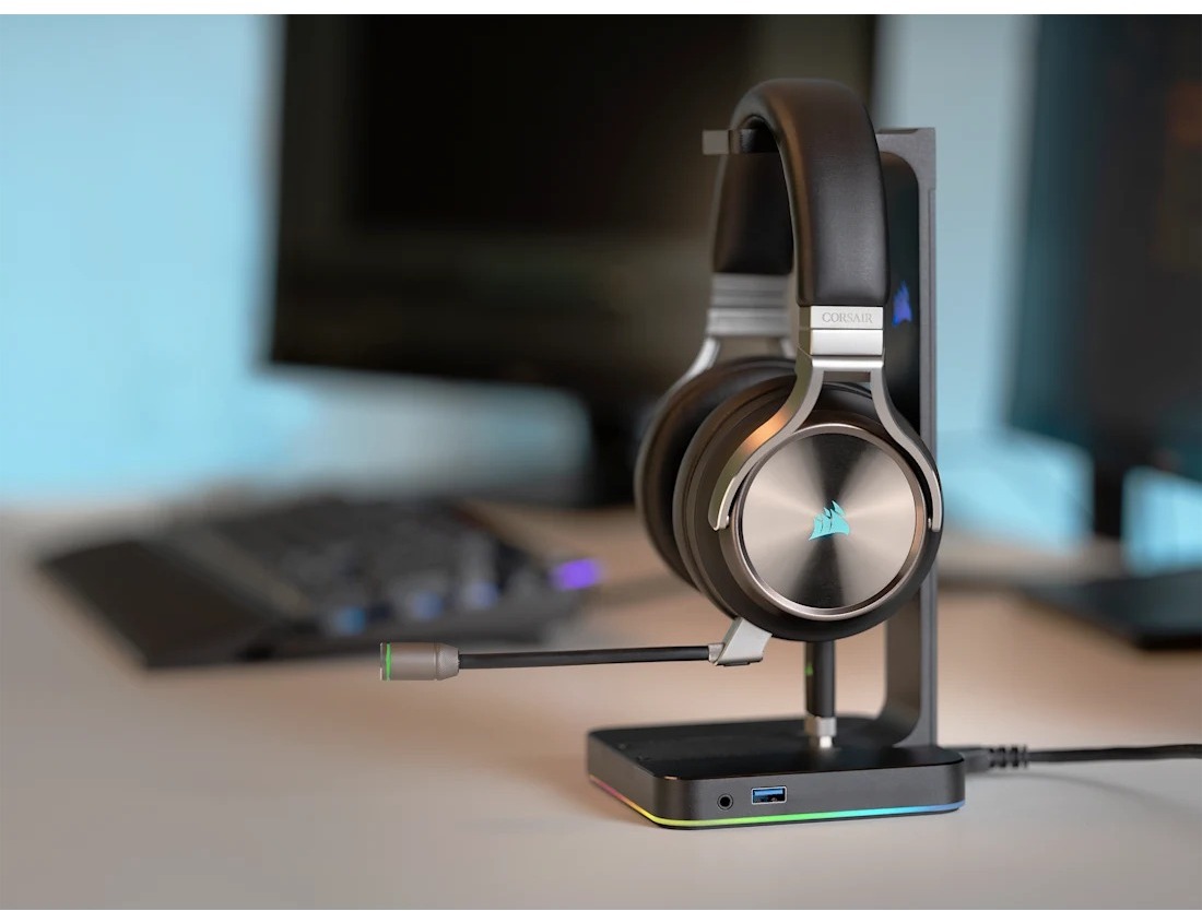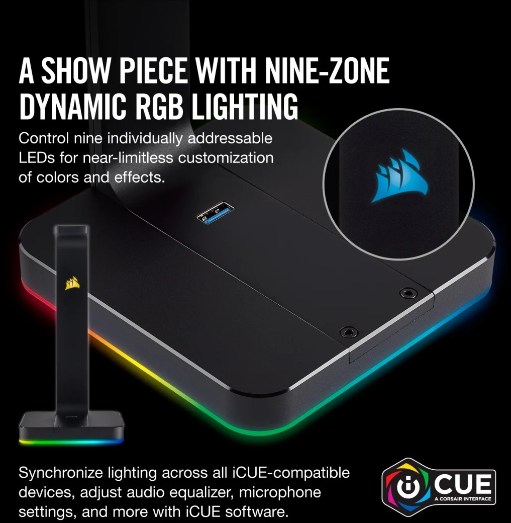 Особливістю тримача є настроювана RGB-підсвітка з дев’ятьма зонами, якими можна керувати через програмне забезпечення CORSAIR iCUE. Ви можете вибирати з десятків готових ефектів або створювати власні, щоб підкреслити індивідуальність вашого сетапу. Вбудований 3,5-мм аудіороз’єм підтримує стереозвук або віртуальний 7.1-канальний об’ємний звук, забезпечуючи глибоке та захоплююче звучання для будь-якої сумісної гарнітури.