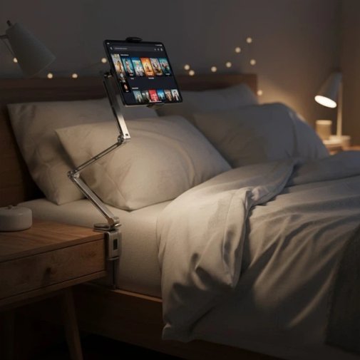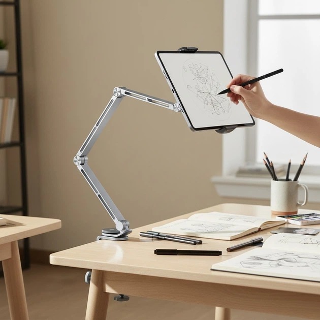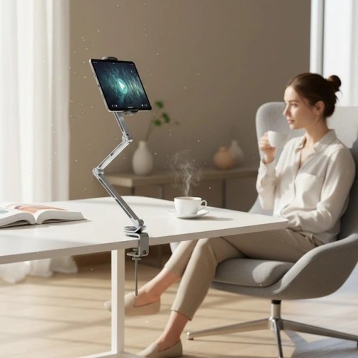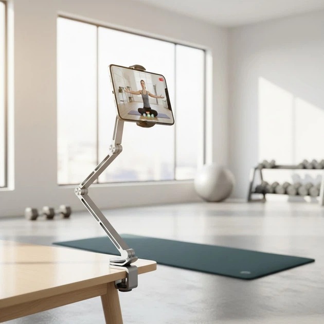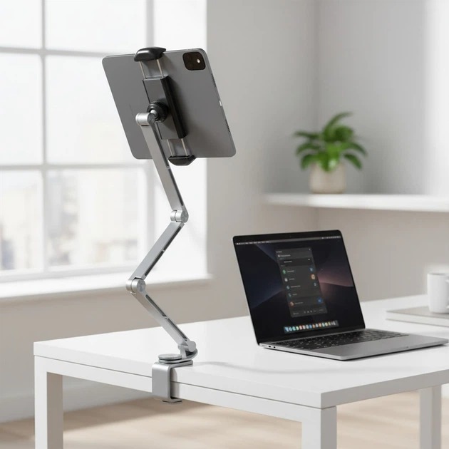 Консольна конструкція тримача забезпечує гнучке налаштування висоти та відстані пристрою, а поворотний механізм на 360° дозволяє швидко змінювати орієнтацію екрану з вертикальної на горизонтальну без необхідності знімати смартфон або планшет. Завдяки цьому Rtako T01 ідеально підходить як для відеоконференцій і дистанційного навчання, так і для перегляду фільмів чи роботи з документами.