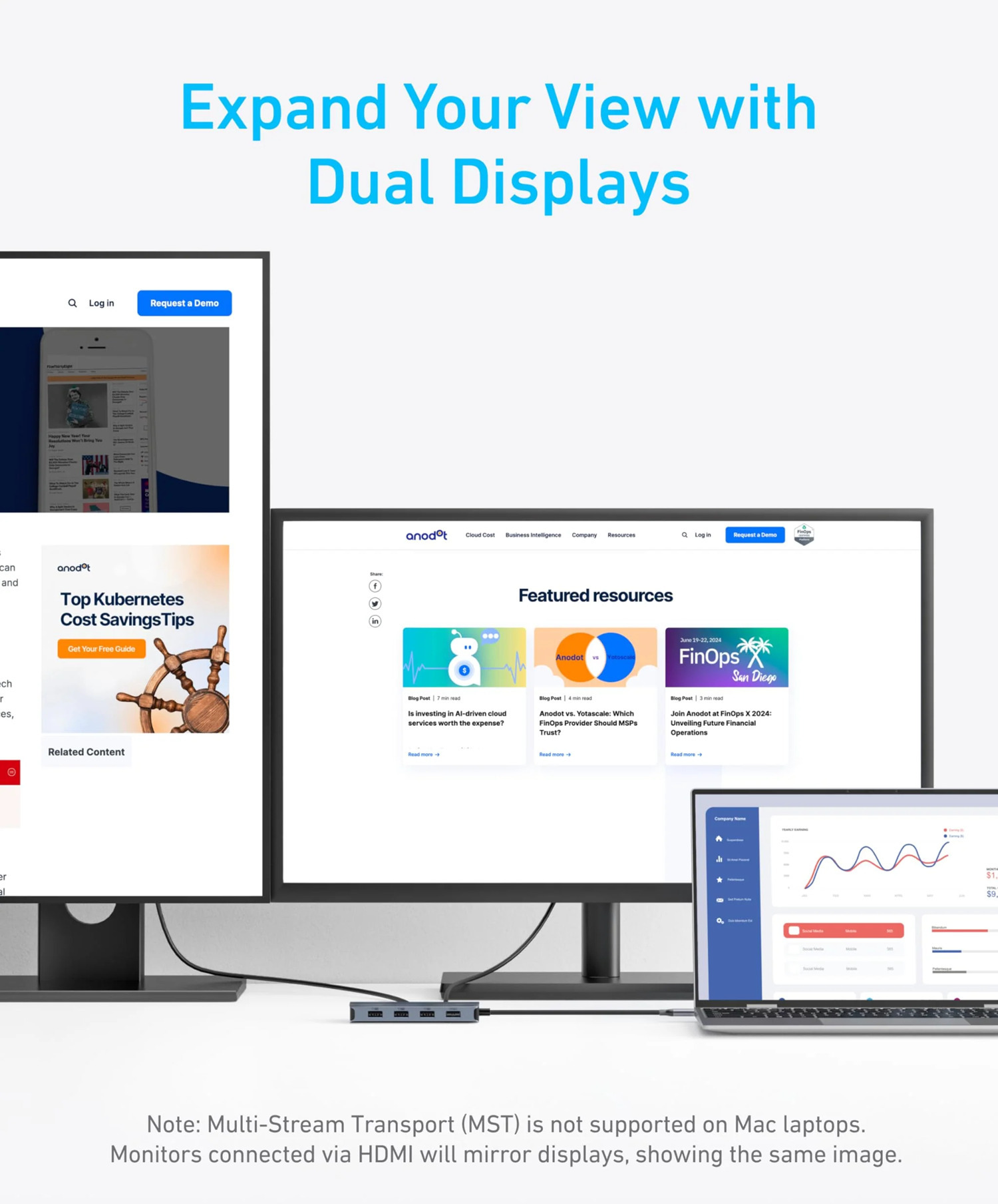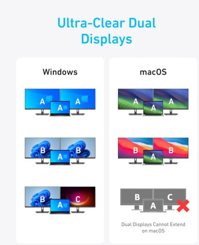 Сім портів в одному корпусі охоплюють USB-C з Power Delivery, USB-A, та HDMI — все для одночасної роботи без жодних перемикань. Підтримка двох зовнішніх дисплеїв одночасно з роздільною здатністю до 1080p@60 Гц на кожному дозволяє розгорнути повноцінний мультиекранний робочий простір прямо з одного USB-C порту.
