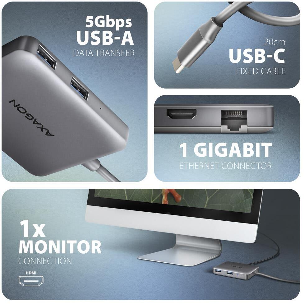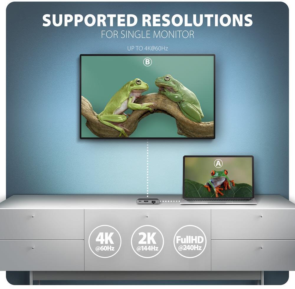 HDMI-вихід видає чітке зображення 4K@60 Гц з HDR, 2K до 144 Гц або FullHD до 240 Гц — ідеально для другого монітора, презентацій чи ігор. Вбудований гігабітний LAN-порт RJ-45 гарантує стабільне дротове з’єднання зі швидкістю до 1000 Мбіт/с там, де Wi-Fi слабкий або ненадійний.