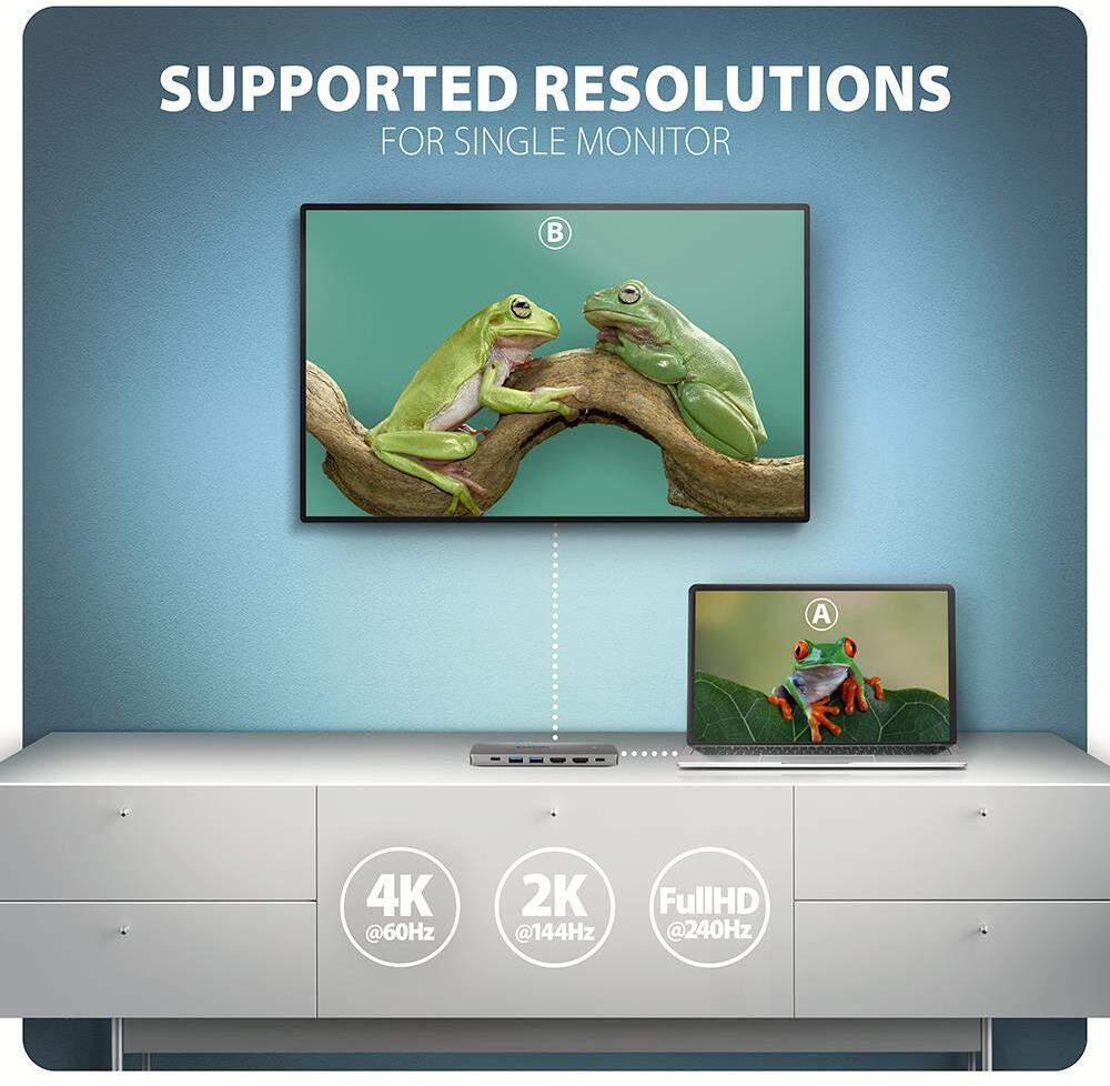 Хаб оснащений двома HDMI-портами, які дозволяють підключати два дисплеї з роздільною здатністю до 4K/60Hz Ultra HD одночасно. Підтримується HDR, HDCP 1.4/2.2, багатоголосний звук до 8 каналів та високі частоти оновлення (2K/144Hz, 1080p/240Hz). Для максимальної якості потрібен USB-C порт ноутбука з DisplayPort Alternate Mode 1.4 або Thunderbolt 3/4.