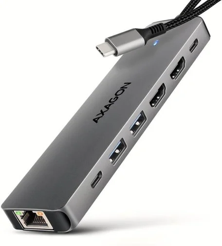 Axagon HMC-7HX2 — це сучасний мультипортовий USB-C хаб стандарту 5 Gbps (USB 3.2 Gen 1), який перетворює один порт ноутбука чи телефону на сім повноцінних роз’ємів. Завдяки компактному алюмінієвому корпусу та кабелю довжиною 15 см пристрій стає ідеальною мобільною док-станцією 7in1 для роботи з двома моніторами, периферією та Gigabit-мережею.