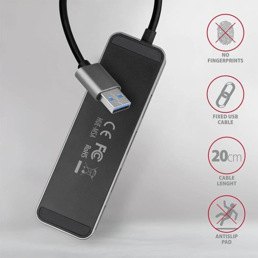 Корпус AXAGON HUE-MSA виготовлено з міцного алюмінію, який забезпечує надійний захист від механічних пошкоджень і сприяє ефективному відведенню тепла. Гумові ніжки запобігають ковзанню, а приємна на дотик матова поверхня не залишає відбитків. Завдяки компактним розмірам 102 × 31 × 10 мм і вазі лише 39 г пристрій легко поміщається на столі чи в сумці поруч із ноутбуком.