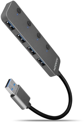 AXAGON HUE-MSA — це універсальний металевий USB-хаб стандарту USB 3.2 Gen 1, що поєднує високу швидкість передачі даних, індивідуальне керування кожним портом і функцію заряджання мобільних пристроїв. Він дає змогу одночасно підключати до чотирьох USB-пристроїв і керувати живленням кожного з них натисканням кнопки. Завдяки міцному алюмінієвому корпусу, елегантній текстурі поверхні й продуманій ергономіці цей хаб стане практичним інструментом для дому, офісу чи поїздок.