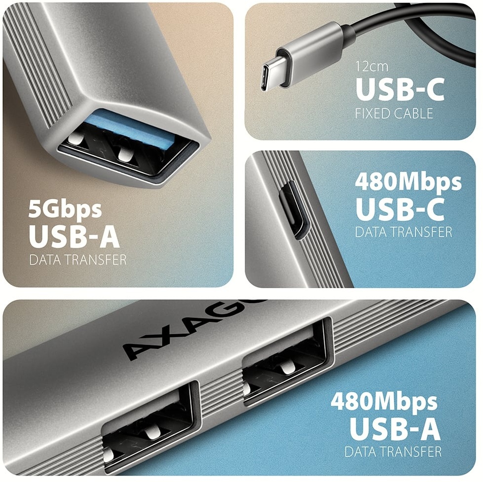 Хаб пропонує чотири порти з різними швидкостями під різні завдання. Перший порт USB-A зі швидкістю 5 Гбіт/с ідеальний для підключення зовнішніх накопичувачів і флешдисків — передача великих файлів відбувається швидко і без затримок. Два порти USB-A 480 Мбіт/с забезпечують надійне підключення миші, клавіатури, принтера та інших стандартних периферійних пристроїв. Четвертий порт USB-C 480 Мбіт/с дозволяє підключати смартфони, навушники та інші сучасні пристрої з відповідним роз'ємом. Усі порти підтримують зарядку мобільних пристроїв, зокрема iPad.