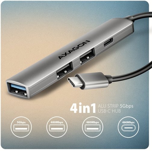 Axagon HUE-STC ALU STRIP — це ультракомпактний чотирипортовий USB-C хаб у тонкому алюмінієвому корпусі, розроблений насамперед для використання в дорозі. Завдяки габаритам всього 88 х 17 х 9 мм і вазі 22 г він практично не займає місця в сумці й завжди готовий до роботи — достатньо під'єднати його коротким кабелем USB-C довжиною 12 см до ноутбука, смартфона чи планшета.