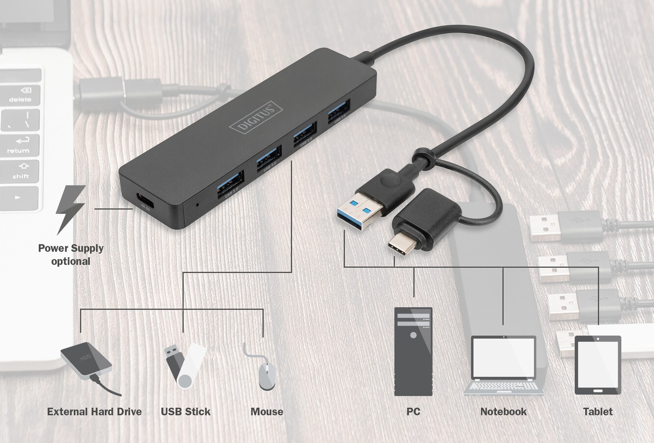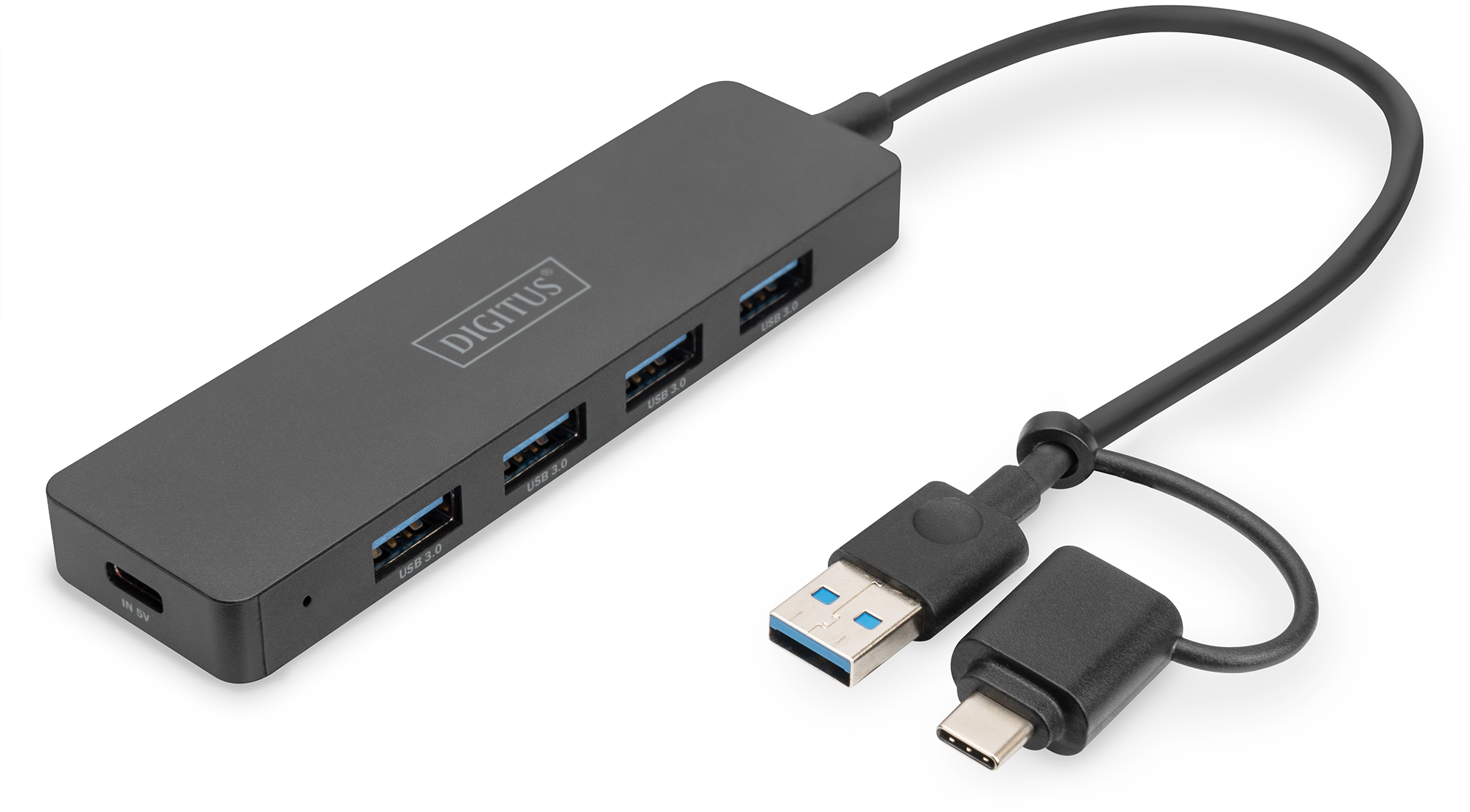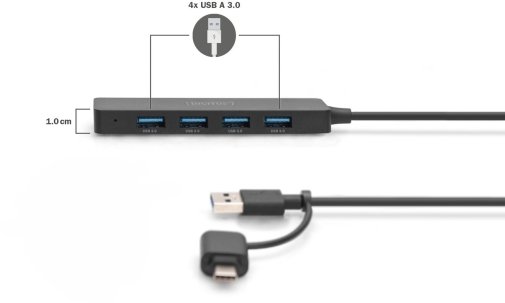 Digitus DA-70235 — це компактний і функціональний 4-портовий USB-хаб стандарту USB 3.0 (5 Гбіт/с) з додатковим USB-C адаптером, що робить його максимально універсальним для сучасних ноутбуків, ПК, моніторів та інших пристроїв. Ця модель ідеально підходить для тих, хто хоче швидко розширити кількість портів без зайвого зайняття місця на робочому столі чи в дорозі.