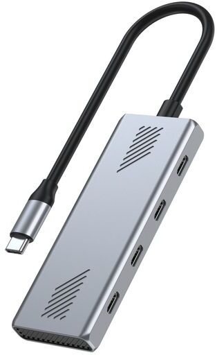 Корпус виконаний з алюмінію у поєднанні з ABS-пластиком — сріблясте металеве оздоблення виглядає стримано і сучасно, а розміри 100 х 36 х 10 мм і вага лише 47 г роблять хаб майже непомітним на робочому столі або в сумці. Конструкція без окремого кабелю у комплекті спрощує повсякденне використання: хаб завжди готовий до роботи, нічого не загубиться і не переплутається.