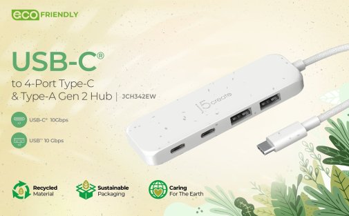 J5create JCH342ER-N — це компактний екологічний USB-C хаб стандарту USB 3.2 Gen 2, який перетворює один USB-C порт на чотири роз’єми. Пристрій забезпечує швидкість передачі даних до 10 Гбіт/с і ідеально підходить для ноутбуків, таких як MacBook чи Chromebook, де бракує USB-портів для периферії. Виготовлений з перероблених матеріалів, хаб акцентує на стійкості та портативності.