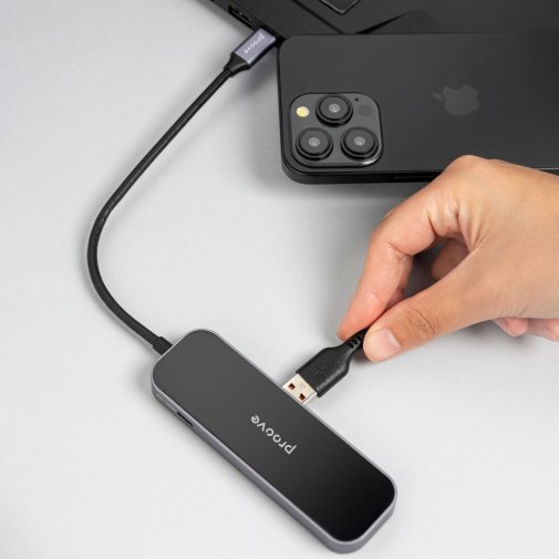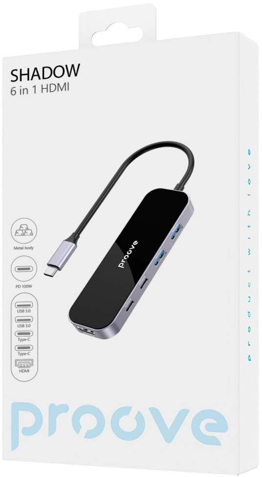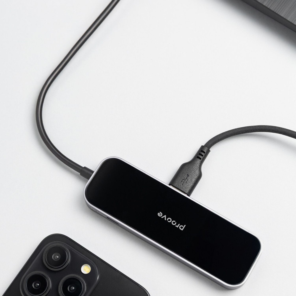 Proove Shadow важить лише 57 грамів і має розміри 110×35×12 мм — він легко поміщається у кишеню або відділення для аксесуарів у рюкзаку. Якщо вам потрібен компактний хаб для подорожей або роботи поза офісом, це рішення поєднує максимум функцій у мінімальному форматі.