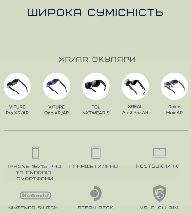 Компактний алюмінієвий корпус легко поміщається в кишеню, а міцна конструкція витримує щоденне використання. Сумісний з iPhone, iPad, MacBook, Windows-ноутбуками, Steam Deck, Nintendo Switch та XR-окулярами.