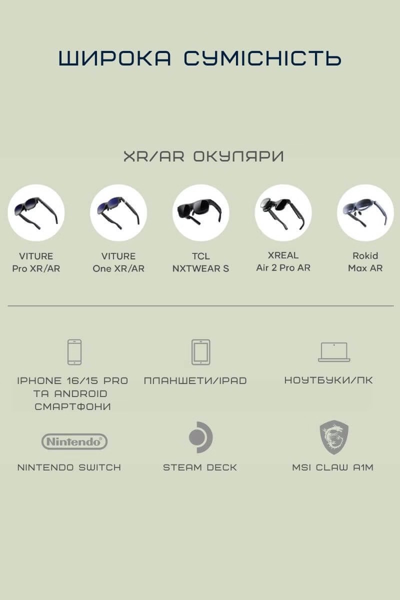 Потужне заряджання через USB-C PD до 100 Вт дозволяє підтримувати заряд пристрою навіть під час інтенсивного використання. Завдяки цьому ви залишаєтеся в повному зануренні з XR-окулярами без ризику розрядити основний пристрій.